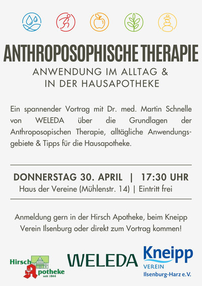 In diesem informativen Vortrag gibt Dr. med. Martin Schnelle (WELEDA) einen praxisnahen Einblick in die Grundlagen der anthroposophischen Therapie. Er zeigt auf, wie natürliche Heilmethoden sinnvoll im Alltag eingesetzt werden können und gibt hilfreiche Tipps für die eigene Hausapotheke.